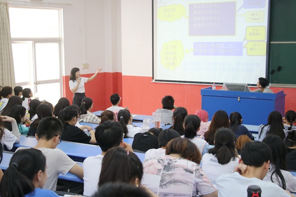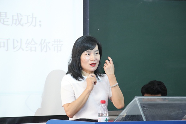 紧接着,杨丽女士引用到了安东尼·罗宾斯的成功万能公式“成功=明确目标+详细计划+马上行动+检查修正+坚持到底”,同时,她为同学们讲到她的职业生涯,并以故事的方式为同学们分享她在就业过程中遇到的趣事并鼓励同学们走出去看世界,见多识广。