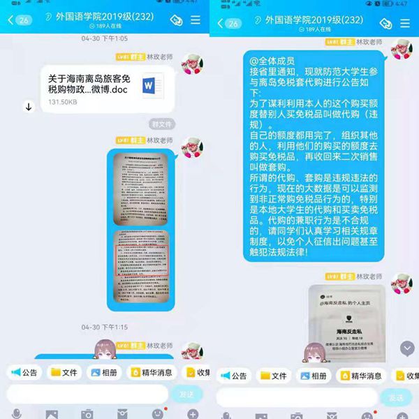 我院于4月30日组织全员参与并开展了线下主题班会,班级群也上传相关文件。在做好网上宣传海南免税购物政策的同时,还召开班委例让班委们对学生参与“套代购”违法行为的相关内容进行宣传、教育。