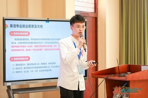 我校进入到本次决赛的学生共有三名,其中包含我院英语1901班王峻民。在准备初赛期间,王峻民在我院思想导师林玫老师的指导下,以海南自贸港建设为背景,针对自己的职业目标——中学英语教师,就自我认知、职业认知、职业决策、计划与路径及自我监控这五个方面,通过运用人才测评工具、自评分析方法等对自己进行了全方位、多角度的自我分析后,认真详细的撰写了个人职业规划书。同时,王峻民也认真去设计和完善大赛所需要的个人简历,保证能在最大程度上展现自己的优势。 图:王峻民在路演展示