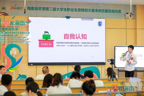 王峻民表示进入决赛是在自己的意料之外,但是进入决赛环节后也会不断的磨练自己,努力争取更好的结果。决赛时需要进行路演演讲,在准备决赛期间,他也在指导老师的帮助下,对自己的参赛PPT进行修改和完善。在比赛前,他也通过反反复复的试讲,在试讲中发现有不足或讲解不清楚的地方,也及时的进行了修改更正。 最终,王峻民在这次比赛中荣获了决赛优秀奖。他表示在这次的大赛中也见识到了来自海南各大高校的参赛选手的优秀作品及精彩的路演展示,参加比赛也是对自己目前的认识进行了一次查漏补缺,同时他也从其他参赛选手路演学到了很多自己根本想不到的且很有创意的路演想法,也了解了各位参赛选手在海南自贸港建设大背景下,如何去实现自己职业目标的独特见解。 图:王峻民在路演展示