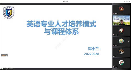 为了使新生更加了解就读专业,对专业课有更加具体清晰的认知,尽早确定其努力的方向,更好地规划未来。9月28日8:00,我院于腾讯会议开展了英语专业入门指导课程,本次会议由院长助理邓小兰副教授主讲,我院2022级英语专业新生集体参与。