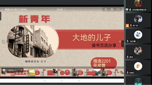 俄语2201班的吴岸霖同学给大家分享了大地的儿子这本书,讲述了周恩来总理的传奇一生,非常契合本次分享会的主题。