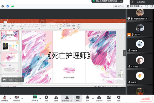 英语2002班的杨然同学在制作了精美ppt进行分享的同时配上了十分契合的音乐,声情并茂的讲述也使大家有身临其境的感觉,非常具有特色的书籍也引起了大家的兴趣。