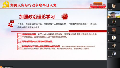 为深入贯彻习近平新时代中国特色社会主义思想,端正积极分子的入党动机,我院学生党支部于10月6日14:30通过腾讯会议组织了线上入党积极分子培训,由我院学生党支部书记袁威老师主持,全体入党积极分子参加。