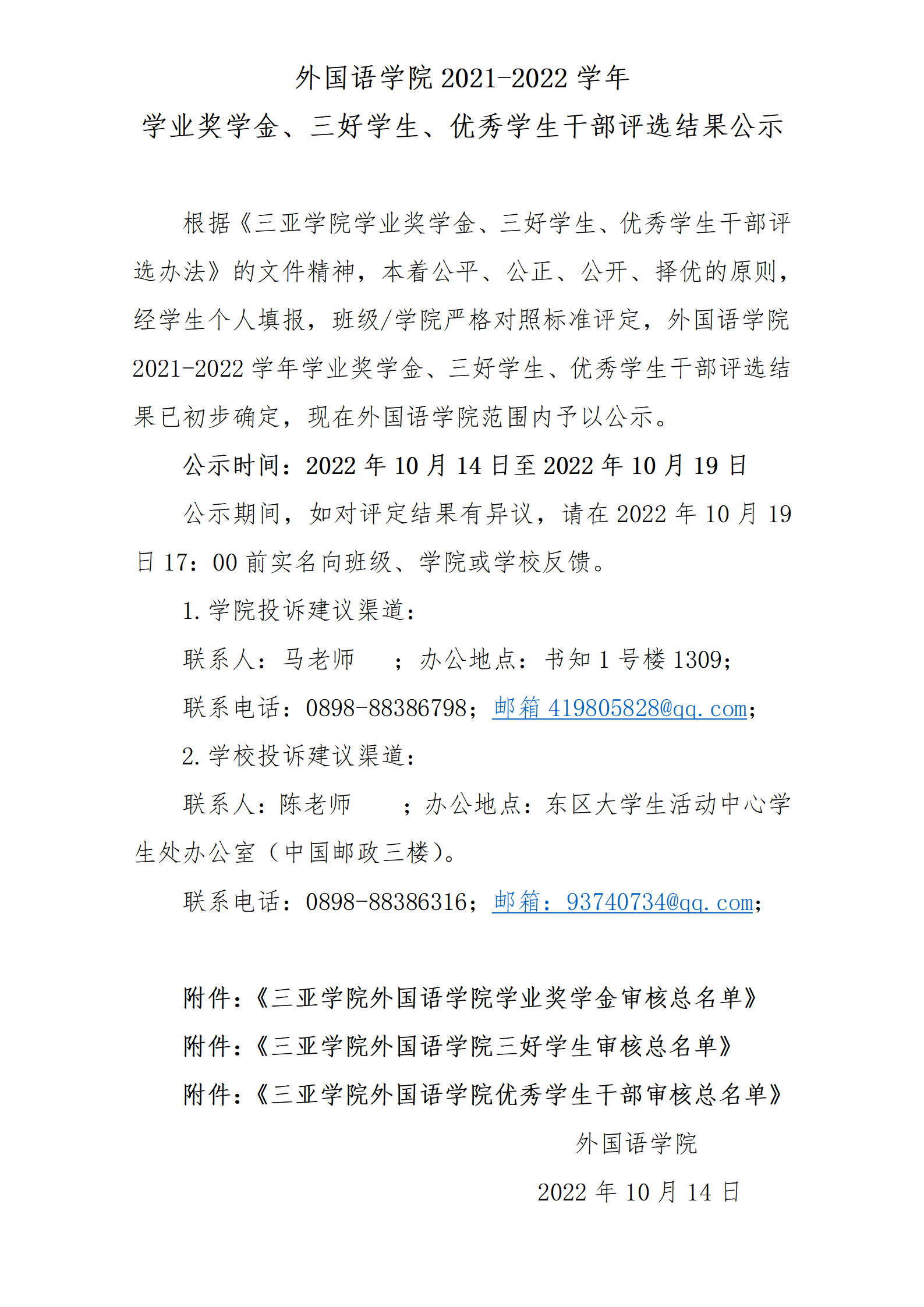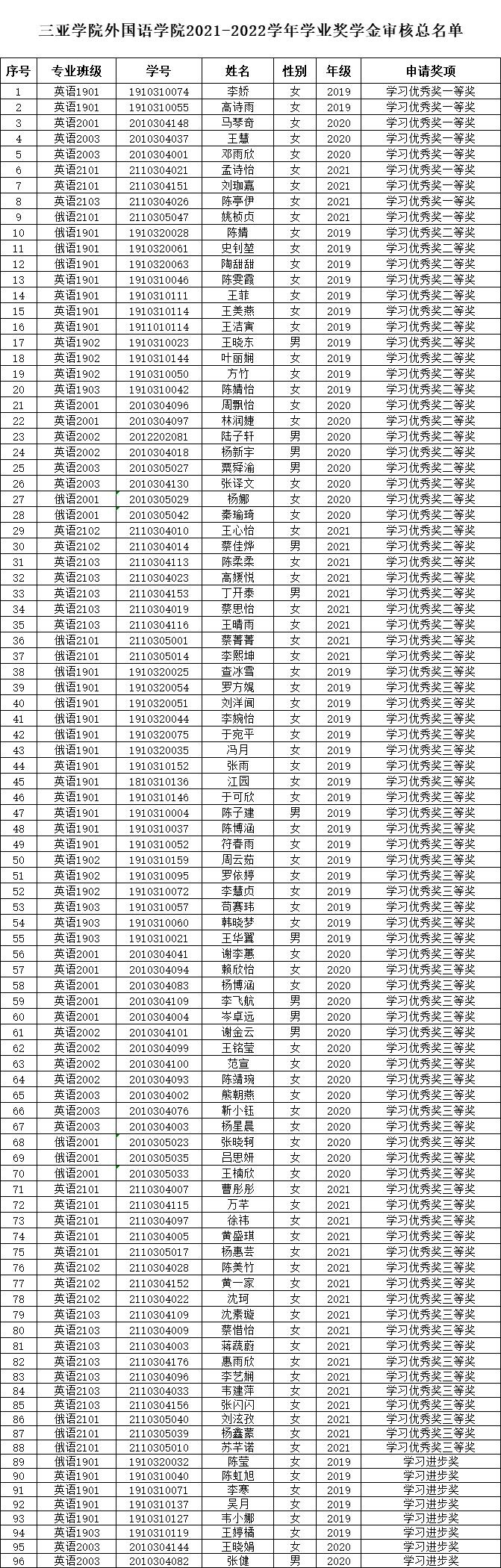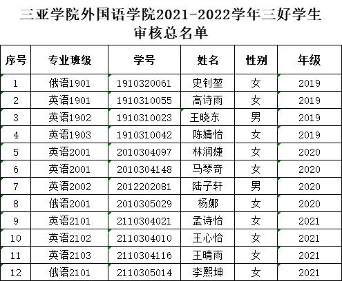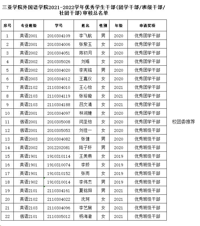 2021-2022学年三亚学院学业奖学金、三好学生、学生干部评选结果公示