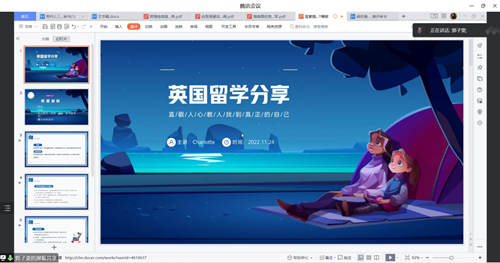 11月24日下午,为更好地帮助英语系毕业生认识了解海外留学相关情况,我院于线上召开英语系海外留学经验分享会。本次会议由思想导师林玫老师主持,我院郭子雯老师出席会议,全体英语系毕业生参与。