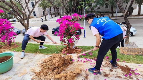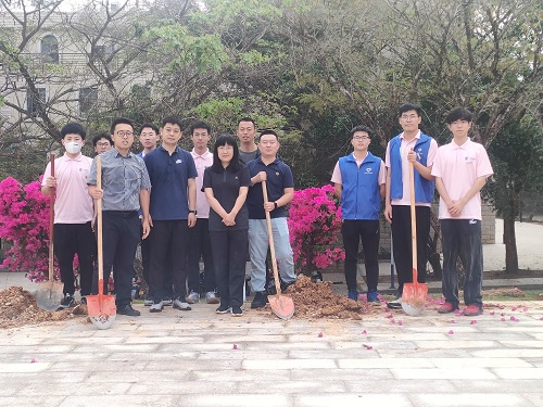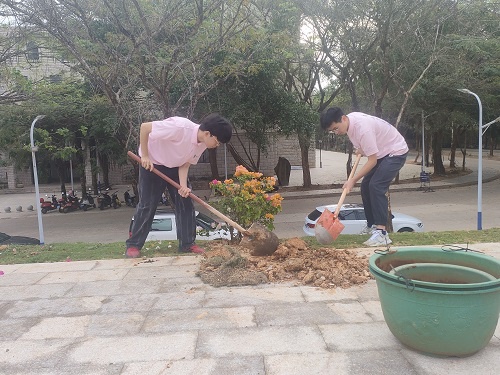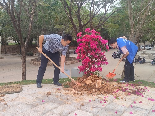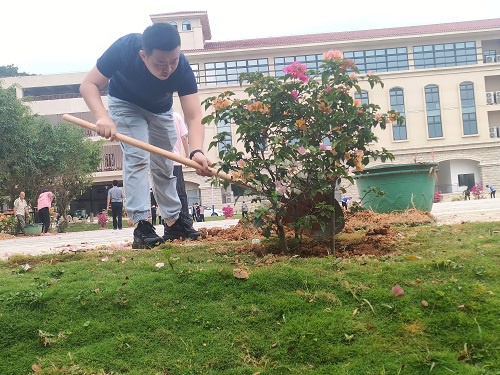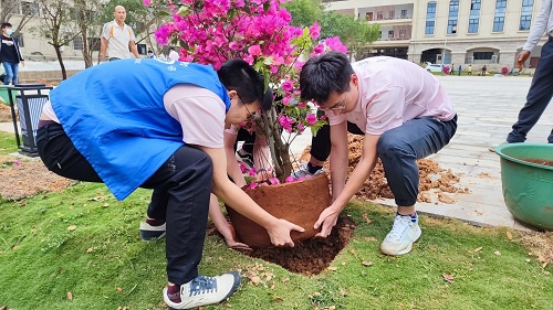 活动开始,在老师们的带领下,同学们进行挖坑、植树,大家热情高涨、分工明确、干劲十足。师生们一起挥锹铲土、扶苗填坑、踩实浇水,各个环节井然有序,每一个步骤都认真对待,把一颗颗花苗植入泥土里,整个劳动现场呈现出一片热火朝天的景象,充分展示了“同呼吸、共命运、心连心”的新时代磅礴力量。经过辛勤的劳动,花苗迎风而立,向阳而生,充满勃勃生机。