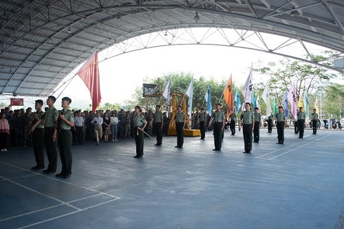 首先由护旗手高扬国旗,迈着坚定有力的步伐缓缓走向升旗台,蓄势待发,伴随着国歌声,五星红旗在全场瞩目下冉冉升起,全体老师、教官、同学们奏唱国歌,揭开了开场仪式的帷幕。紧接着由教官队进行表演,铿锵有力的军体拳、整齐划一的刺杀操,都展示着教官队伍英姿飒爽的夺目风采。 护旗仪仗队