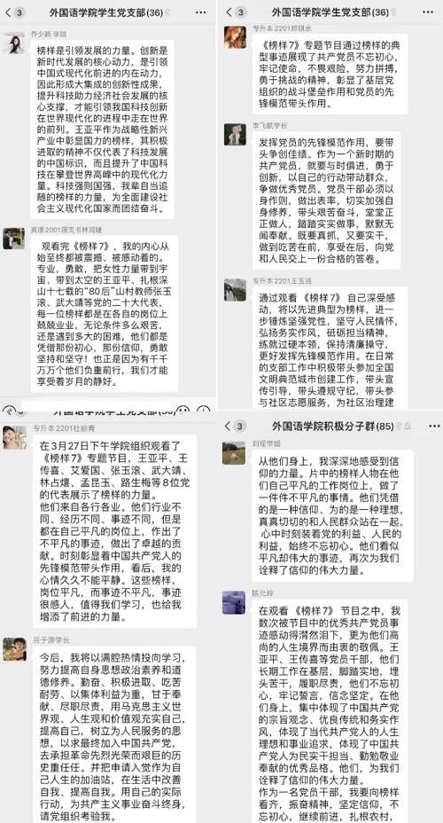 为充分发挥先进典型示范引领作用,外国语学院学生党支部积极分子、预备党员及以上同志于3月27日13:00在书知楼1107观看《榜样7》专题节目,教育引导大家学习榜样,争当先进,担当作为,建功立业,号召全体同学践行初心使命,传承榜样力量。 榜样是我们学习的目标,是激发我们前进的动力。我们要向榜样学习,向榜样看齐,真心实意为人民服务。榜样是一面镜子,是一个方向,更是一种正能量。学习榜样身上的精神,靠的是信仰,为的是理想,心中时刻装着党和人民,用实际行动诠释全心全意为人民服务的内涵。 观看结束之后大家各抒己见,纷纷发表自己的观后感,我们通过深入学习榜样的事迹来提升思想境界,以榜样来坚定信念,树立更为高尚的道德情操,要将榜样的力量内化于心、外化于行,带头学习和弘扬新时代榜样精神,把榜样力量转化为实际行动,以更高标准要求自己。