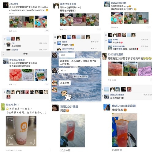 在训练休息期间,各部门部长们为各自部门的干事们准备了各式各样的慰问品,充分体现了我院团学组织各部门之间的和谐氛围以及各部门部长对本部门干事的关心关怀。不仅如此,各部门部长们也同干事们分享了自己的军训心得,激励干事们要积极适应军训期间的高标准和严要求,努力锻炼自我、提升自我。 我院团学组织各部门干部们的关怀与慰问,以及精心准备的慰问物品,给在骄阳中参训的干事们送去了丝丝清凉,让他们感受到了我院团学组织的浓浓温情,有助于增强我院团学组织的凝聚力与向心力。 图片:外国语学院 文字:闵怡雪 编辑:闵怡雪 审核:袁 威
