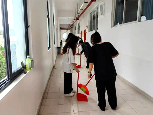 在我院学生干部们的带领下,同学们拿着劳动工具来到对应楼层开始打扫,扫地,拖地,他们迅速进入劳动状态。劳动过程中,对教学楼墙壁、地面、窗户及卫生死角进行“细致化”打扫。同学们相互配合,地面被打扫的干干干净净无纸屑无杂物垃圾。