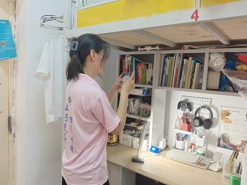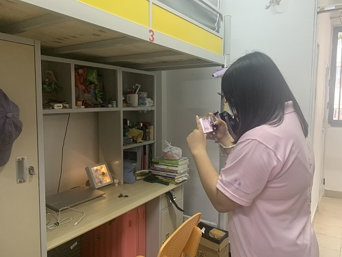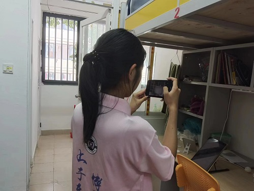活动中,学生干部们认真走访学生寝室,对每个寝室的环境和基础设施进行拍照留存,以便后期评审。