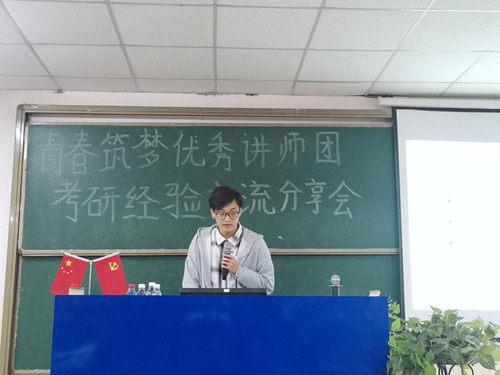 第二位分享者是任河宇,他首先和同学们分享了择校时需要考虑到的方面:地区、学校、自身实力。随后并就各个学科的详细进度安排、相关资料与同学们进行了交流,提醒同学们在进行考研准备时一定要明确自己的目标,对自己的薄弱科目加强训练,对自己的优势科目进行巩固。最后,他还鼓励同学们要肯坚持、敢拼搏、不放弃,保持良好的心态,朝着自己的目标坚定奋斗。