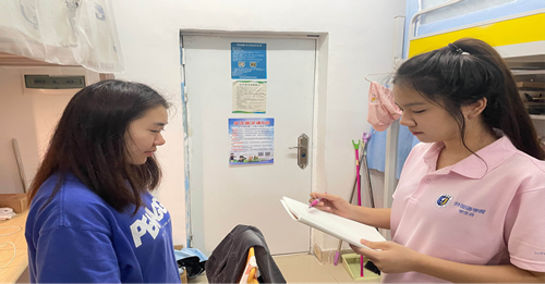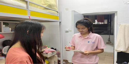 2023年6月8日21:30,外国语学院学生会公关联络部干事李沐子、陈曼妮在外国语学院女生宿舍开展暖心走访、关心女生活动。