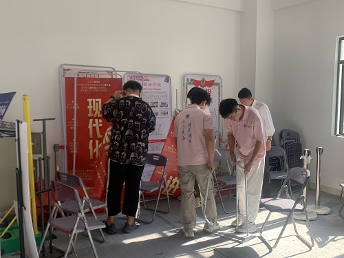 为了更好地促进我院迎新工作的开展,展示我院风采,9月6日8:40,我院学生干部以及预备党员及以上的同志分别于书艺馆和南区迎新处开展迎新现场布置工作。 布置工作开始前,我院学生干部们分为两个小组,一组负责将所需的物品搬运至书艺馆迎新现场,另一组则负责书艺馆迎新现场的物品组装摆放。 在布置现场,学生干部和预备党员及以上的同志们分工细致,搭展架、搬桌子,井然有序的将物品摆放整齐。现场的工作者们都怀着积极热情的态度,认真布置迎新现场。 不仅如此,我院党总支副书记马炳琛老师、团委副书记王艳琴老师以及思想导师张芮楠老师也莅临现场,指导了我院迎新场地的布置工作。 现场布置工作进行的如火如荼。在迎新报到现场也架设了关于我院专业的基本介绍、学院特色以及近年我院的人才培养成果展示图,有助于新生和家长更好的了解我院的专业育人情况,既展现了我院产教融合的教学特色,又突出了其博学明德的人文关怀。 本次迎新现场的布置工作,不仅展现了我院学子们积极向上的精神风貌,更体现了我院对迎新工作的重视。以心“迎新”,以情“赢心”,在我院师生的共同努力下,各项迎新准备工作已全部就绪,期待2023级新生们的到来! 图片:邓雯敏 朱 玲 文字:闵怡雪 编辑:闵怡雪 审核:王艳琴