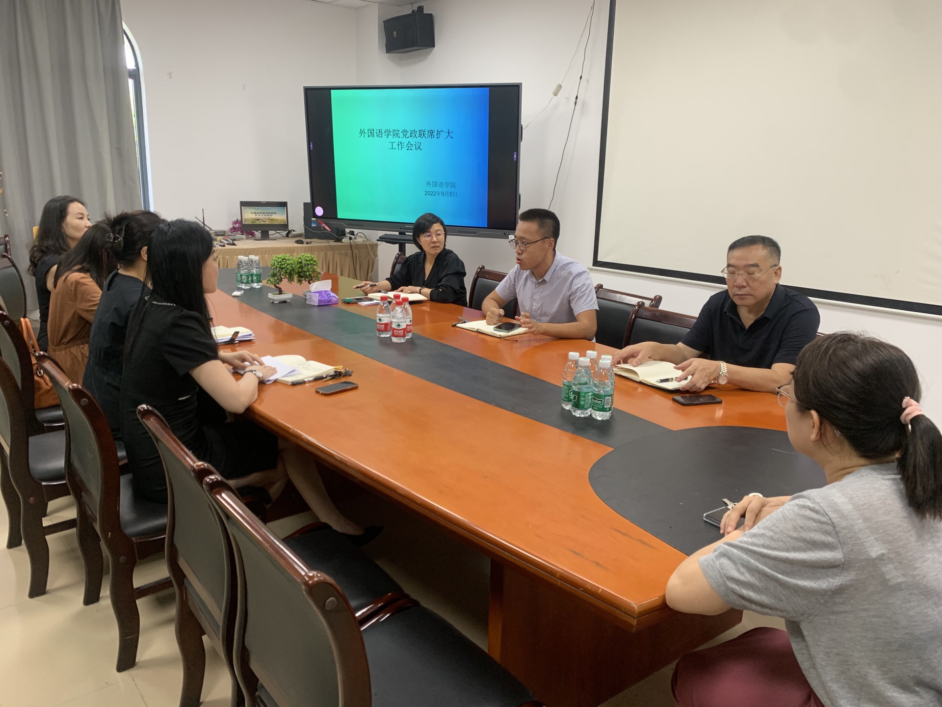 2023年9月5日9时外国语学院在书知楼1410召开新学期第一次党政联席扩大会议,学院副院长邓小兰、党总支副书记马炳琛、英语系副主任余玉秀、俄语系副主任吴亚男、公共外语教学部副主任张晓辉、团委副书记王艳琴、英语系骨干教师潘红参加了本次会议。会议对学院人事调动进行通告,学院领导对晋升老师表示祝贺和感谢,对新入职老师表示热烈欢迎。
