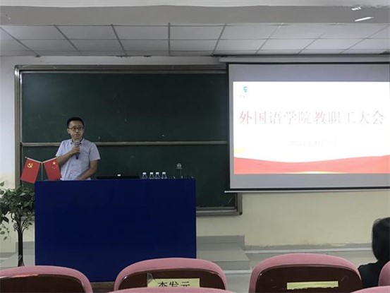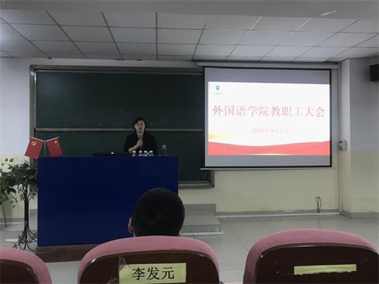 2023年9月5日下午15:30,外国语学院在书知楼1107教室召开了新学期第一次全体教职工会议。会议由党总支副书记马炳琛主持,全体教职工参加了会议。