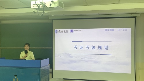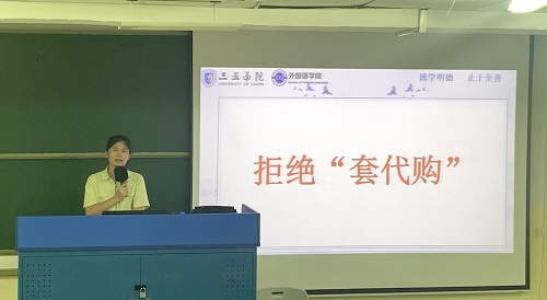 紧接着,她向大家强调安全问题,加强自我防范意识、保护个人隐私,并向同学们讲解防止套代购的内容。另外,她对同学们谈及大学考证考级规划,希望同学们做好大学四年的规划,明确目标理想。