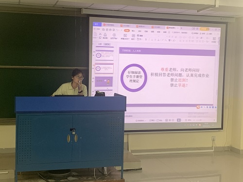 为更好地建设校园文明,培养同学明礼守德的文明意识,9月12日19:00我院于书知楼1310开展文明守纪教育课,由思想导师张芮楠老师主讲, 2023级全体同学参与此次课程。