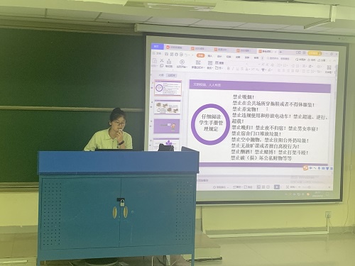 课堂伊始,张芮楠老师和2023级同学们一起阅读学生手册部分管理规定,让同学们明确“校园四禁”:“禁止吸烟、禁止在公众场所穿拖鞋或不得体服装、禁止养宠物、禁止违规使用和停放电动车,禁止超速逆行超载”;接着,她向新生们提及了在校期间的纪律的要求,比如上课不可以迟到、缺勤、旷课等,她要求同学们要完成课堂考勤,遵守课堂纪律要求;最后,近期天气多为雨天,张芮楠老师提醒同学们要注意骑行安全,做到安全第一。