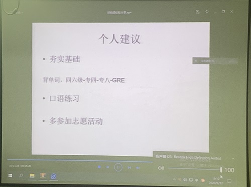 首先由线上英语优秀校友18级胡晓超为2023级同学讲述了他的学习考研经历,并建议同学们如何去规划自己的校园学习和考研计划,比如四六级的考试以及英语专四专八,他希望2023级同学们可以端正学习态度,在大学里不断前行。