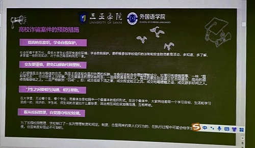 本次课程当中,王艳琴老师根据不同情况可能发生的安全隐患向同学们进行一一讲解;如在校内遇到可疑人物应提高警惕,并及时报告给保卫处;也要注意保管好自己的身份证、钥匙、银行卡、校园卡等重要物品,以防“不速之客”伺机行窃。在发现发生盗窃案后应立即报告学校保卫处或当地派出所。遇到陌生来电时应警惕是否为诈骗电话,预防电信诈骗;同时王艳琴老师也向我们分享了一些高校诈骗案件的预防措施。