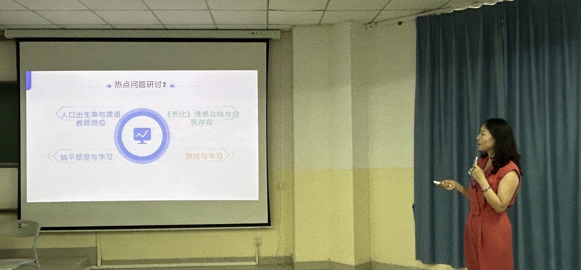 余玉秀副教授首先围绕热点问题并收集了同学们提出的各种话题和同学展开讨论,她对这些问题进行解答并利用话题引导同学们进行思考和讨论。
