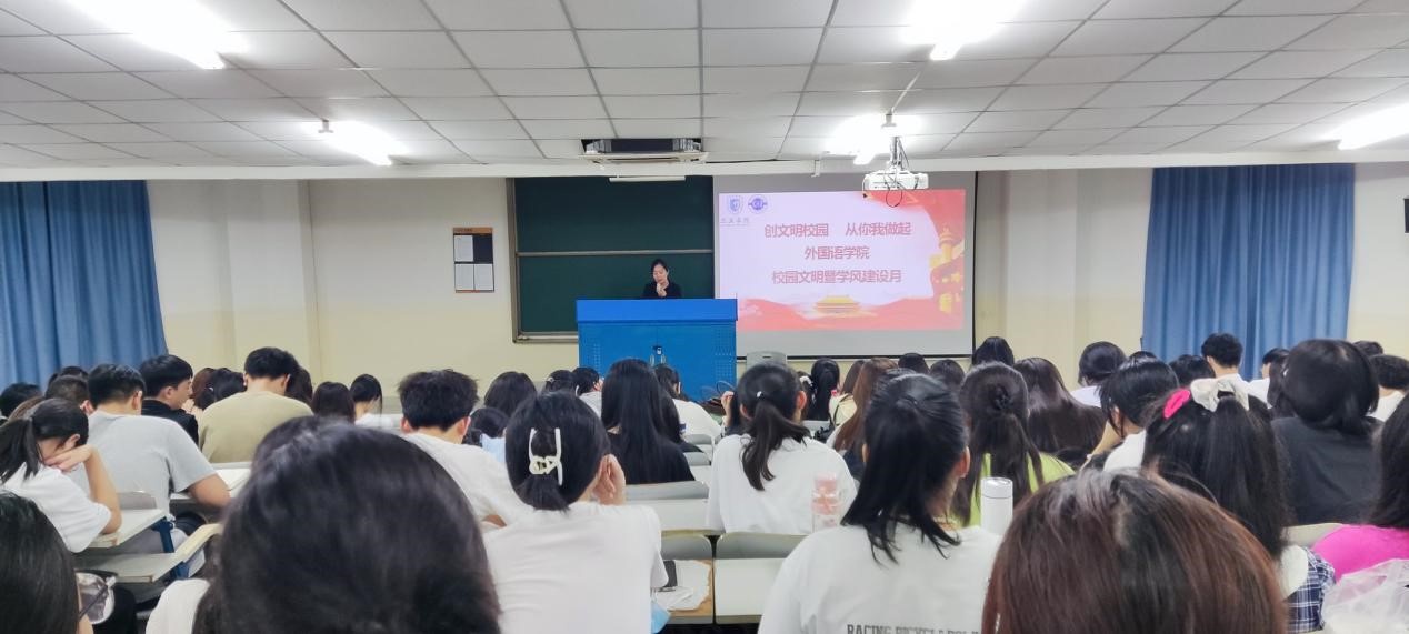 为创建文明校园,加强学风建设,9月15日19:30,我院于书知楼1310召开“创文明校园 从你我做起-----外国语学院校园文明暨学风建设月”启动仪式。我院团委副书记王艳琴老师主持会议,各班班级代表及全体2023级新生参加会议。