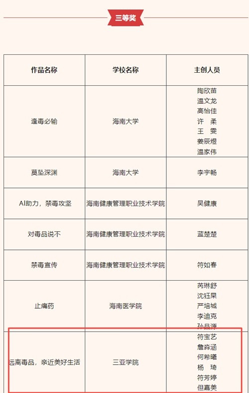 为了提高大学生对毒品危害的认识,2023年9月1日至9月30日,海南省禁毒委员会办公室联合海南省教育厅部署开展主题为“建设海南自贸港 无毒青春勇担当”大学生禁毒公益短视频大赛活动。其中,我院学生符宝艺、詹淼涵、何希曦、杨琦、 符芳婷、但嘉美,作品《远离毒品,亲近美好生活》在全省多所高校的大学生参与的作品中脱颖而出获得三等奖。