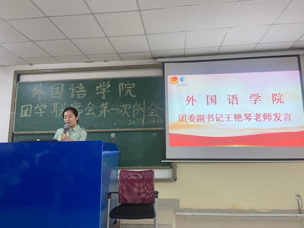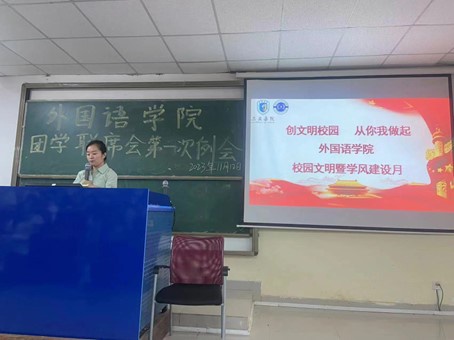 为聚焦产教融合战略,提升学生干部工作能力,加强我院团学组织各部门沟通与交流,2023年11月12日20:00,我院于书知楼1107教室开展了团学联席会第一次例会,我院团委副书记王艳琴老师,思想导师张芮楠老师与思想导师解博琛老师出席此次会议,外国语学院大一大二全体班委、及团学组织各部门成员参加此次会议。