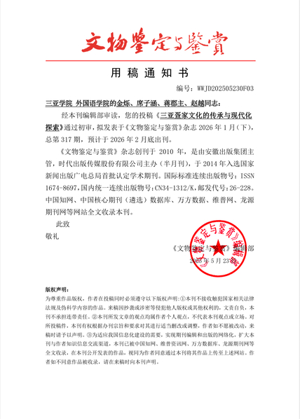 2025年,项目组已收到《文物鉴定与鉴赏》期刊的用稿通知书。四位同学深入三亚疍家社区,运用专业知识开展调查,通过口述史访谈、影像记录等方式,系统梳理文化脉络,为三亚疍家文化的保护与传承贡献了青年智慧。