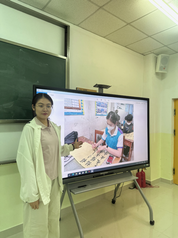 课程特邀张学明老师进行主题分享。张老师以生动详实的亲身经历,带领同学们完成了一场文化之旅。她首先分享了在泰国华校举办中华文化体验营的经历:从教当地小朋友书写毛笔字时笔墨之间的专注,到指导绘制国画时水墨交融的意境;从展示太极拳一招一式中的刚柔并济,到与孩子们共同感受中华传统艺术的魅力。这些经历让同学们深刻体会到文化传播的温度与力量。