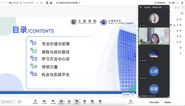 王老师介绍,翻译专业课程涵盖语言基础、笔译、口译、跨文化交际、AI 翻译工具应用,成长路径分“夯实基础 — 精进专业 — 实践提升”三步,以语言功底与技术工具运用能力为核心培养方向。同时,王老师建议新生课堂深耕语言训练,课外借双语材料、外文影视、交流实践提升能力,秉持长期积累心态学好专业。