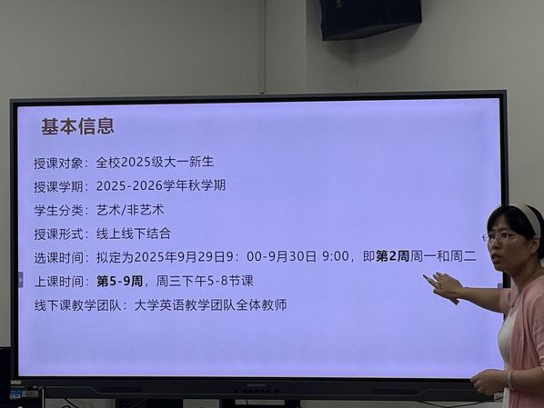 在会议的核心环节,赵主任逐项明确教学改革内容的关键信息:此次教学改革的授课对象为全校2025级大一新生,学生按“艺术类”“非艺术类”分为两类;授课形式采用“线上+线下”相结合模式,其中此次教学改革的线下教学部分由2025级全体英语教师共同承担。