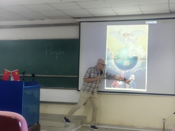 活动伊始,英语外教Paul以英语的全球通用性为切入点,从多维度为学生梳理语言背后的深层逻辑。他结合历史渊源,讲解殖民时期英语的传播脉络与地域渗透;关联意识形态与政治影响,分析国际组织、外交场景中英语的官方语言定位;他还兼顾文化与运动领域,举例好莱坞影视、著名电影IP如迪士尼等、NBA赛事对英语流行度的助推作用。英语角活动将案例与不同内容版块相结合,层层递进,以“地球上的人应该只说一种语言吗?”等兼具开放性与思辨性的问题收尾,瞬间点燃学生的讨论热情,引导他们从被动的语言使用者转向主动的语言现象观察者,真正激发深度思考的兴趣。