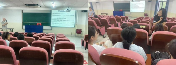 随着 Paul 的讲解落下帷幕,互动讨论环节即刻开启,此起彼伏的英文交流声瞬间打破会场的宁静。现场氛围从有序的聆听状态,一跃转为热烈的思辨场域。有人急着分享观点而微微前倾身体,有人拿着纸笔快速记录同伴的发言要点,还有人在观点不同时举起手轻声补充,每一张年轻的脸上都写满投入与热情。从“语言对身份认知的推动作用” 谈到 “全世界是否都应该说中文”,从 “所有英语语言发言者应该统一固定的口音” 聊到 “跨文化交际中对于本土文化的思考”,观点碰撞间尽显思维活力。学生们主动结合自身观点,用英文与Paul 等教师展开深度对话。整场互动环节持续近20分钟,直至结束时仍有学生围着教师继续探讨。这种全英文的沉浸式交流,不仅让学生在即兴表达中锤炼了口语的流畅度、词汇的精准度,更重要的是,它让语言从课本上的语法规则、考试中的单词短语,变成了能承载观点、传递文化、连接心灵的活工具。