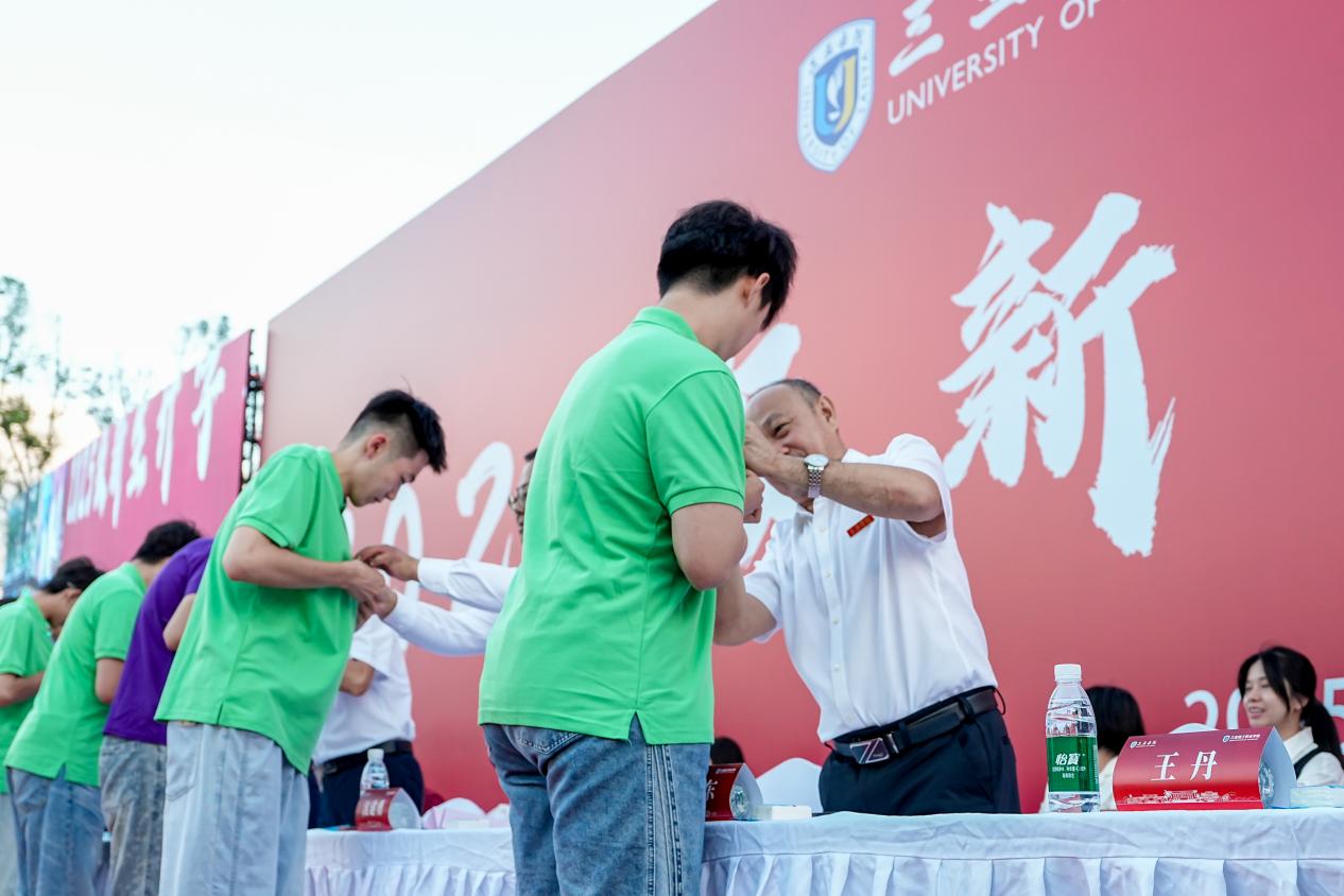 典礼进行第七项,佩戴校徽。阳光下,金色徽章折射着三亚的暖阳,将新生与学校、与海南自贸港这片土地建立起紧密的情感联结,更在他们心间铸起“ 三亚学院人” 的精神铠甲。当徽章稳稳地落在胸前,学校的精神也深深烙印在他们心间。