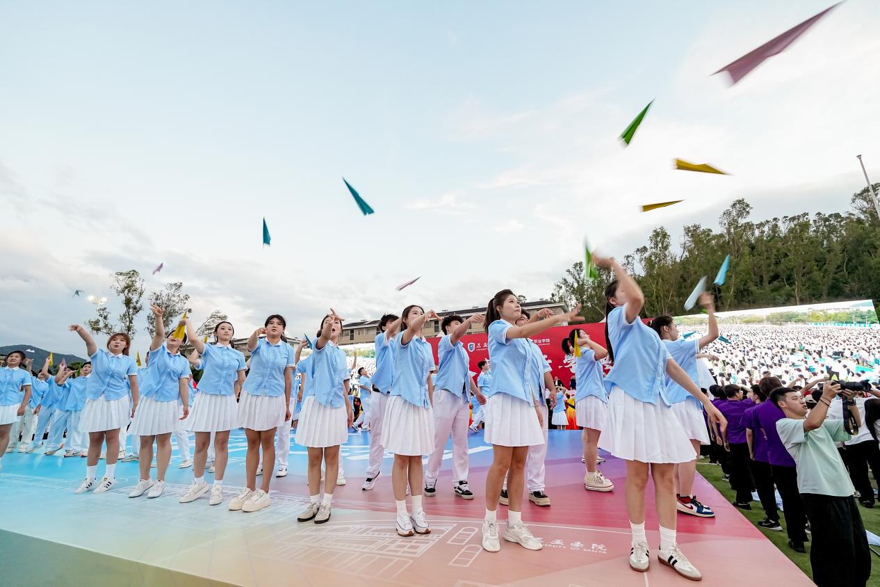 典礼进行第十项,放飞纸飞机。在“ 三、二、一” 的倒计时声中,纸飞机群在阳光下掠过校园上空,似航船穿梭于秋阳,为典礼定格浪漫瞬间。更象征着三亚学院师生将以“ 破界向远” 之姿,共启成长新程。