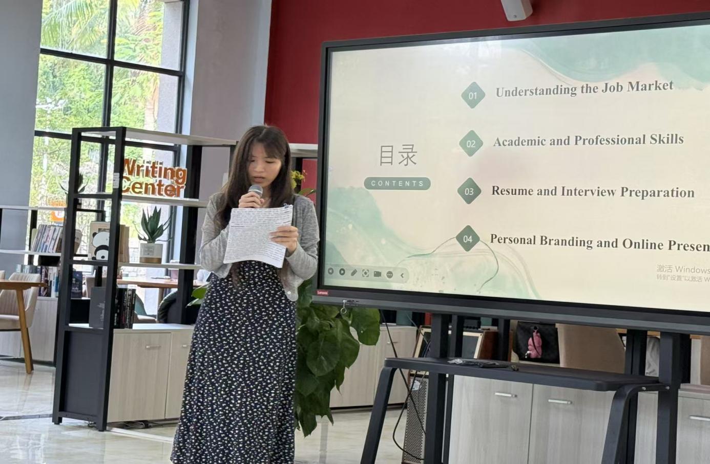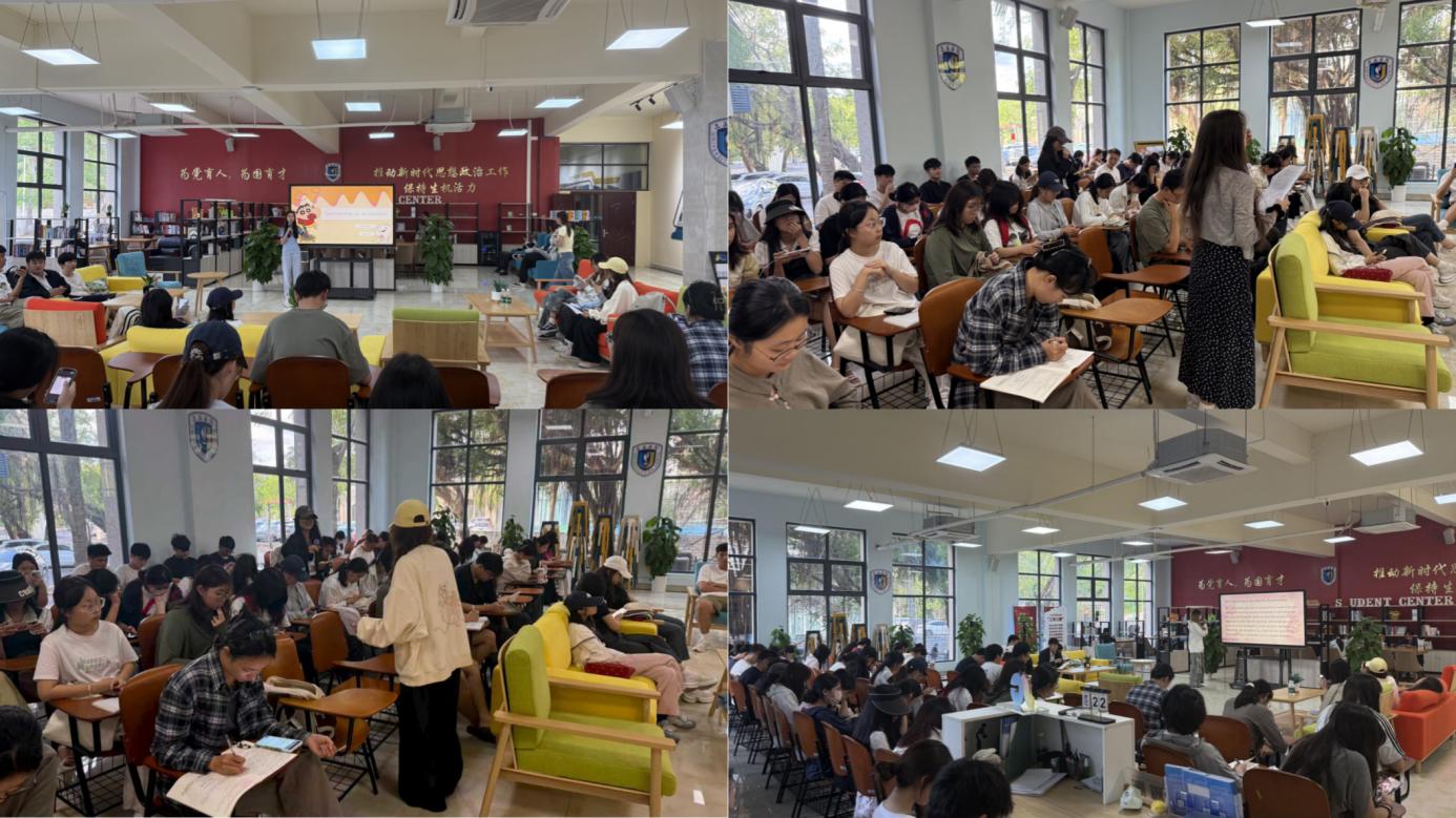 2025102316:00,三亚学院东区书海馆学生中心学业大厅内气氛热烈,一场别开生面Freetalk活动,主题 “Presentation Show-useful knowledge for job preparation”演讲活动在此精彩上演。学业导师付鹃老师精心统筹,来自英语2402班的李伊萱、王明缘、李上冰、刘可心四位同学轮番登场,结合PPT进行了关于就业准备的英语演讲,为同学们带来了一场知识与智慧的盛宴。
