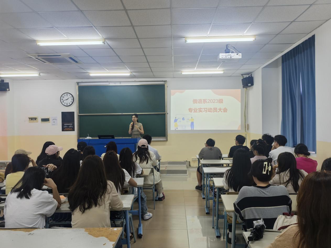俄语系马曌老师就俄语专业实习的具体安排进行了说明,强调实习是提升语言应用能力与跨文化交际能力的重要途径。她特别提醒选择分散实习的学生,须提前提交实习单位接收证明、安全承诺书等材料,学院将从单位资质、实习内容及安全保障等方面严格审核,确保实习过程规范有序。