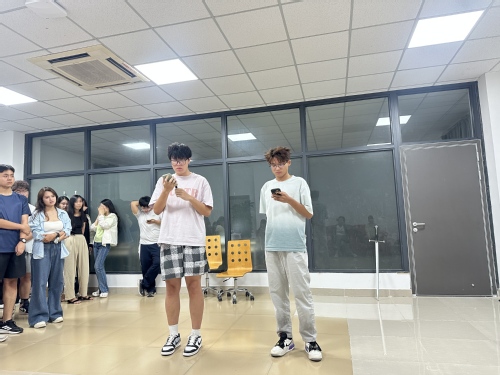 二、雕琢舞台声韵:多语种歌曲表演的排练同样如火如荼。陈翼老师和张学明老师强调“歌以咏情”,指导教师要求学生深入理解歌曲所表达的情感内涵,通过面部表情、肢体语言,将喜悦、忧伤、憧憬等情绪真切地传递给观众,实现跨文化的情感共鸣,并对演唱者的舞台站位、走位路线、与搭档及台下观众的眼神互动进行了反复设计和演练,力求在突出个人特色的同时,保持表演整体的和谐统一与视觉美感。