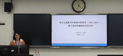 我院英语系教师王初艳老师应邀出席此次会议,并在分论坛中作题为“语料库辅助话语分析视角下西方主流报刊中海南形象的演变研究(1988–2024)”的学术报告。王老师的研究基于自建语料库,系统梳理1988—2024年间西方主流媒体对海南的报道,通过关键词分析、索引行检索与话语主题建模等方法,呈现海南形象在国际舆论场中的阶段性变化。报告不仅揭示了报道视角从资源开发到自贸港建设的转向,同时也展示了西方媒体在经济、文化、旅游等维度上的叙事特点,为提升海南国际传播效果提供了实证参考。