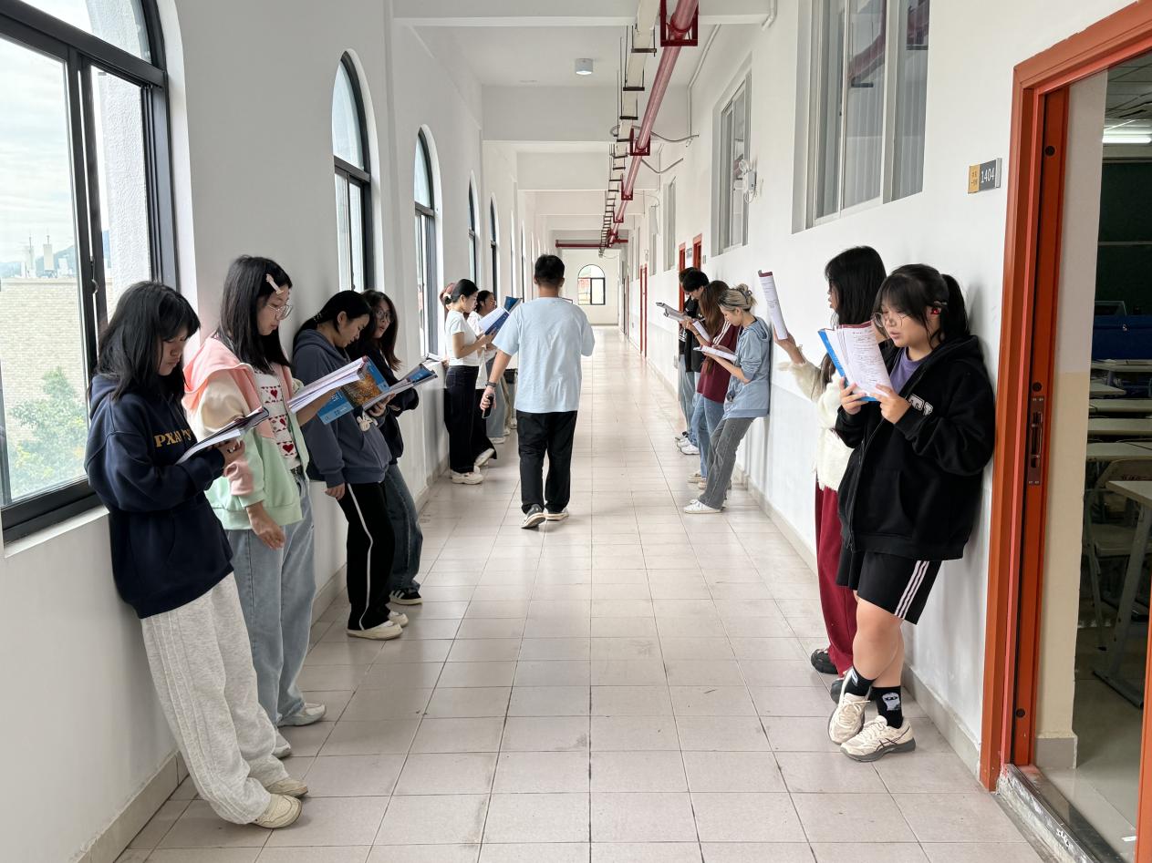 清晨七点半,校园的林荫道尚未被喧嚣唤醒,大一俄语专业2501班的学生们已手持课本,在教室门口列队两排。在暖和的晨光中,标准的俄语发音、流畅的课文和单词朗读声交织回荡,成为外国语学院书知楼一道独特的风景线。