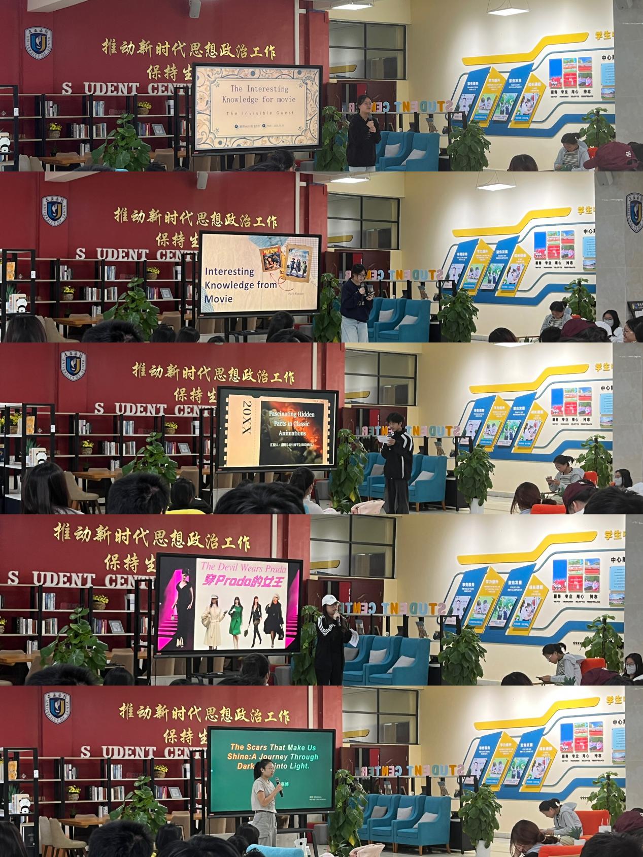 第三位演讲者翻译2401班杨宇同学聚焦动画电影领域,分享了《疯狂动物城》、《狮子王》和《寻梦环游记》三部经典之作,他不仅介绍了各部电影的趣味亮点更精准总结了三者共性--极致的世界观构建深厚的文化艺术根基、对技术创新的深耕追求,从鲜活的角色塑造到独特的文化符号,都彰显制作团队对艺术的敬畏和品质的坚守,让在场听众深刻领略到了动画电影的魅力;“努力未必总有回报,但努力本身仍有价值。”翻译2401的李欣妍同学以这句感悟引出电影《The Devil Wears Prada》的分享。真正的成功不是成为另一个米兰达,而是找回真实的自己。结局让我们认识到,在追求事业成功的同时,不应忽视个人幸福与自我实现。最后一位是来自英语2201的任燕博同学的演讲,分享自己从大学初期的迷茫、学业挫败、与病魔抗争,到经历家庭重大变故,最终在他人帮助和自我觉醒中重拾梦想的历程,以“伤疤使我们闪耀”为核心,诠释了直面真相、坚持不懈、建立有价值的人际关系,是走出黑暗、迎向光明的关键力量。