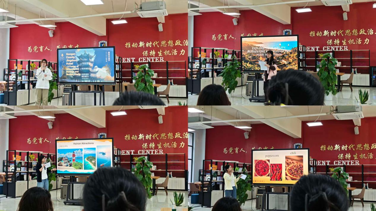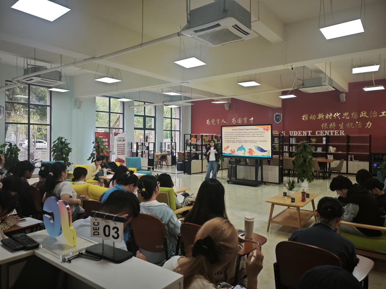 活动伊始,张驰同学率先登场,带着大家走进她的家乡--湖北省公安县。作为荆楚大地上一颗熠熠生辉的明珠,公安县既有“三国文化发源地之一”的历史厚重感,也藏着“公安锅盔焦香酥脆、公安牛肉火锅鲜辣入味”的烟火气;既有着生态湿地的自然灵秀,也在时代浪潮里焕发着发展活力。紧接着,郑舒怡同学为大家解锁了福建的多元魅力。怀着对家乡的深厚情感,她细腻地勾勒出福建独特的地域文化图景,强调传统与现代交融下的创新路径,并鼓励在场同学主动探寻家乡的文化脉络。随后,卓丽爽同学带着椰风海韵气息登场,将大家的视线引向了南海之畔的海南,她给我们介绍了海南的著名旅游景点、地域特色饮食文化等,她结合自身专业详细分析了如何将语言优势与自贸港的发展需求相结合。最后,谢雨婷同学带着山城独有的热辣与烟火气,将大家的视线牵向了“8D魔幻之城”,重庆。从李白诗句中的山水画卷,到今日的魔幻现实之都,重庆以其地理的奇特性、文化的包容性和生活的热辣度,持续向世界散发着无可替代的吸引力。这座“双喜之都”正等待着每一位来访者,亲身感受其8D立体空间中的无限精彩。