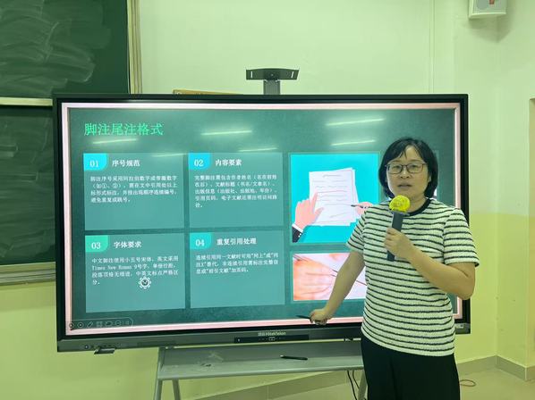 为切实提高师生学术论文写作的规范性与专业性,赵婷教授于12月22日晚19:00在南区1203教室进行了一场聚焦论文格式与标点符号细节的专题讲座。本次讲座以“精研格式·规范标点——学术论文写作细节提升”为主题,包括师生在内的40余人次参与了本次讲座。
