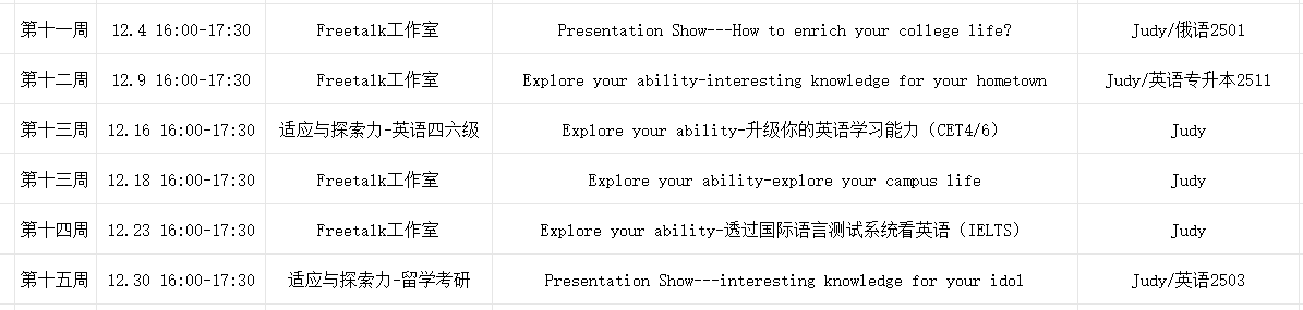 Freetalk工作室的活动预告已经发出,小伙伴们看好你们的档期,和Judy老师一起,在练习英语口语的一路前行!还等什么,快来加入吧!