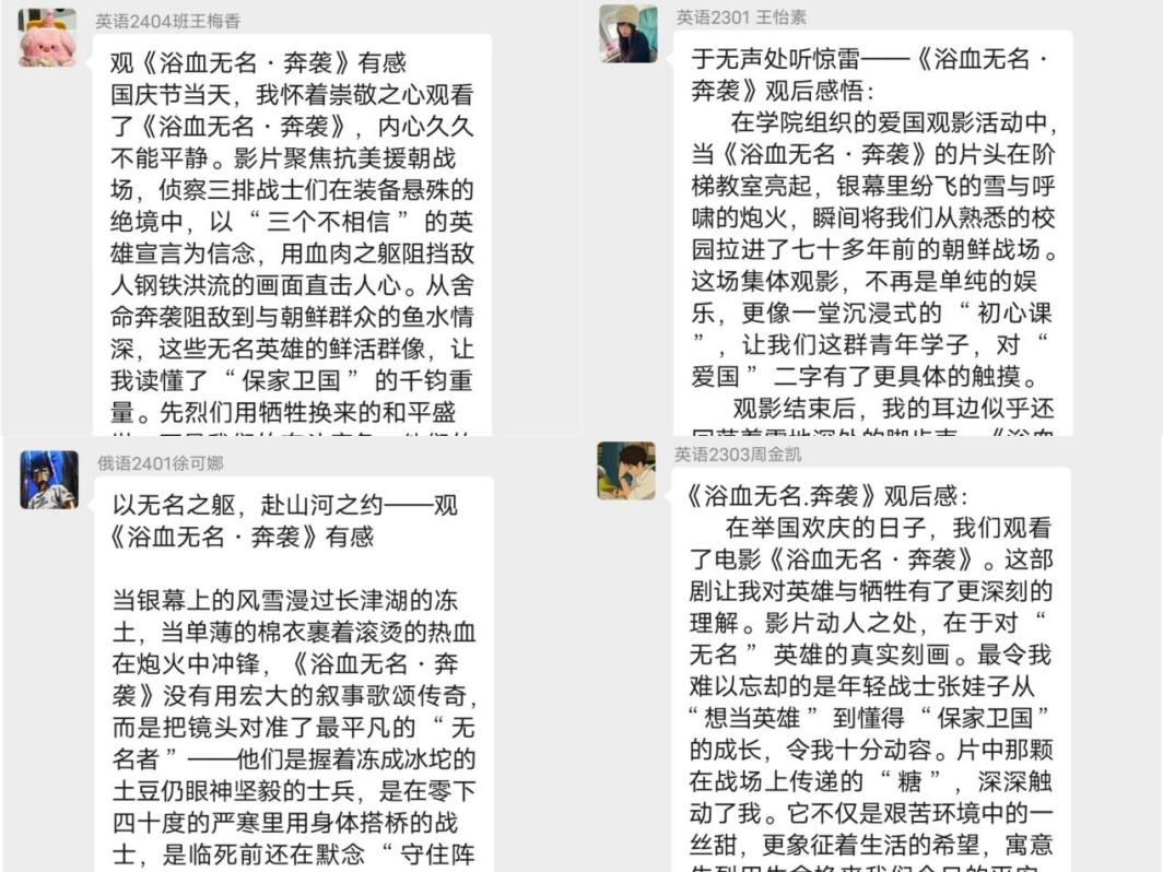 光影回溯战士们血火奔袭,理想与信念在银幕上升腾,也在心中扎根。此次国庆观影,大家纷纷表示:必将把澎湃的爱国热情化为奋楫笃行的不竭动力,以语言为桥、以专业为刃,在讲好中国故事、传播中国声音的新征程上,跑好属于我们的“奔袭”,用青春和才华书写无愧于时代的答卷。