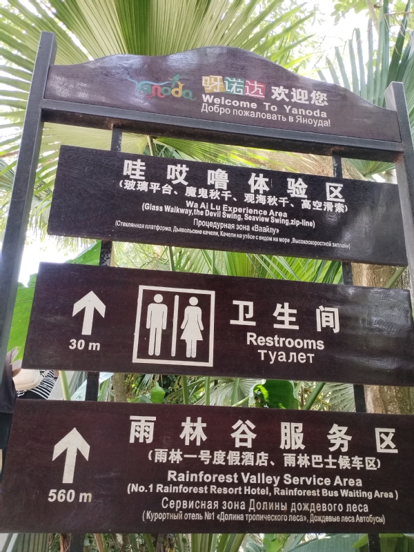 作为海南省具有代表性的热带雨林文化旅游目的地,呀诺达景区不仅拥有独特的自然生态资源,还深度融合了黎族、苗族等少数民族文化元素。调研期间,袁勤老师重点考察了景区各类标识牌、宣传资料、语音导览及讲解词等多模态语言载体,从语言的准确性、表达规范性、跨文化适应性及服务功能性等多个维度进行综合评估。同时,通过与景区工作人员及游客展开交流,广泛收集关于语言服务质量的反馈与改进建议。