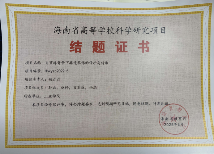 2025年3月,海南省高等学校科学研究项目《自贸港背景下非遗黎锦的保护与传承》顺利结项。